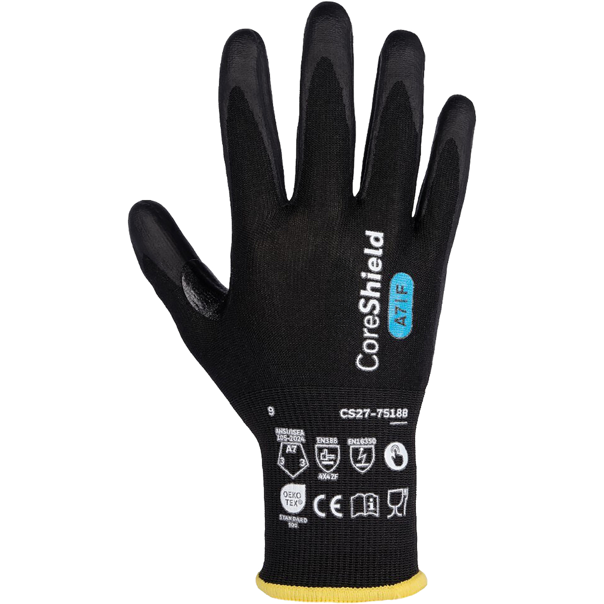 18 gg 防割手套,无缝针织再生聚酯纤维、PE 和钨纤维衬里、丁腈微泡沫涂层和拇指加固,切割水平 F/A7,黑色,带颜色编码